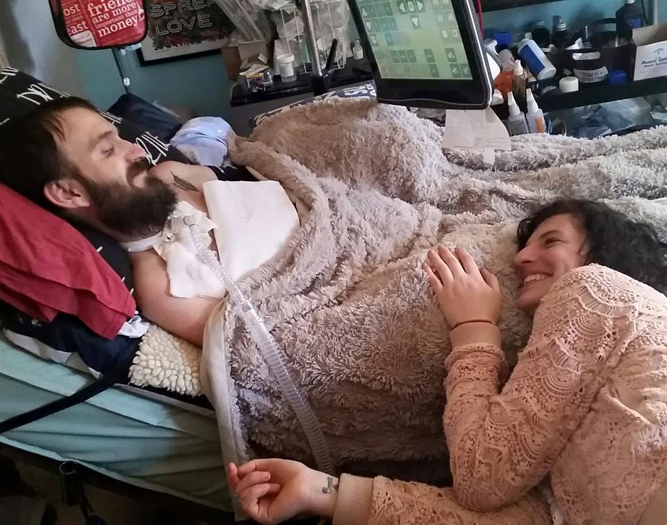 From there, it became a spiral. We'd be home for a day or two, and then end up having to take him back. This went on for months. He died twice, but the hospital staff saved him. Steve slowly started to lose a lot of weight — down to 67 pounds. He developed gastroparesis, where you can't empty your stomach. Everything I fed him, he would throw up. I battled insurance companies because they wouldn't cover alternative food until he got below 70 pounds, which is insane. Finally, he got on IV food, which he's still on, and on a ventilator in January 2014.