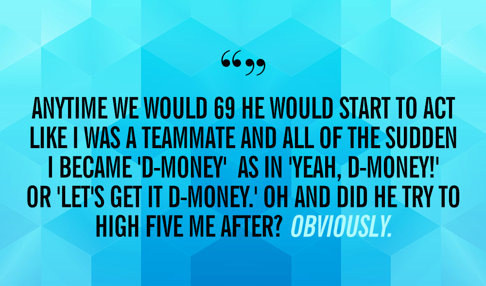 5. "Anytime we would 69, all of a sudden I became 'D-Money.'""I was seeing this guy for a few years who happens to be an NBA player (and someone I had known for years). We started dating and it was like magic. Everything was perfect, until it was time to, uh, share the ball. Anytime we would 69, he would start to act like I was a teammate and all of a sudden, I became 'D-Money' as in, 'Yeah, D-Money!' or, 'Let's get it, D-Money.' It's like we were on the court during the Finals trying to finish strong for the win. But the funny part was it was only during our 'double assist' time together that he would do this. Needless to say I had a lovely time addressing the inspirational words of wisdom with him after a few times of pure puzzlement. Oh, and did he try to high-five me after? Obviously. Teamwork makes the dream work." —DJ, 28