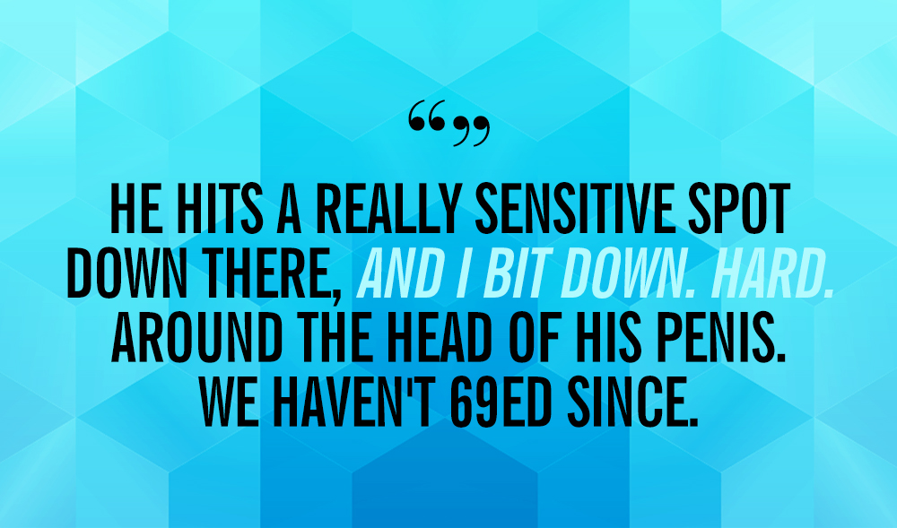 4. "I finally get my mouth around it at the same time that he hits a really sensitive spot down there, and I bit down. Hard.""So my boyfriend and I are getting it on, kissing and touching each other all over, when he goes down on me. I obviously love it, but I guess he was feeling a little jealous because he suggested that we try 69ing. I said sure, since I'd heard about it and thought it was pretty hot, but neither one of us had ever actually done it. So we get in position with me on top and he starts going to town. Well, I quickly realized that it takes a lot of neck strength to be able to raise and lower at that angle, so after a lot of actually missing his penis with my mouth and it literally bobbing at my face, I finally get my mouth around it at the same time that he hits a really sensitive spot down there, and I bit down. Hard. Around the head of his penis. We haven't 69ed since." —Hannah